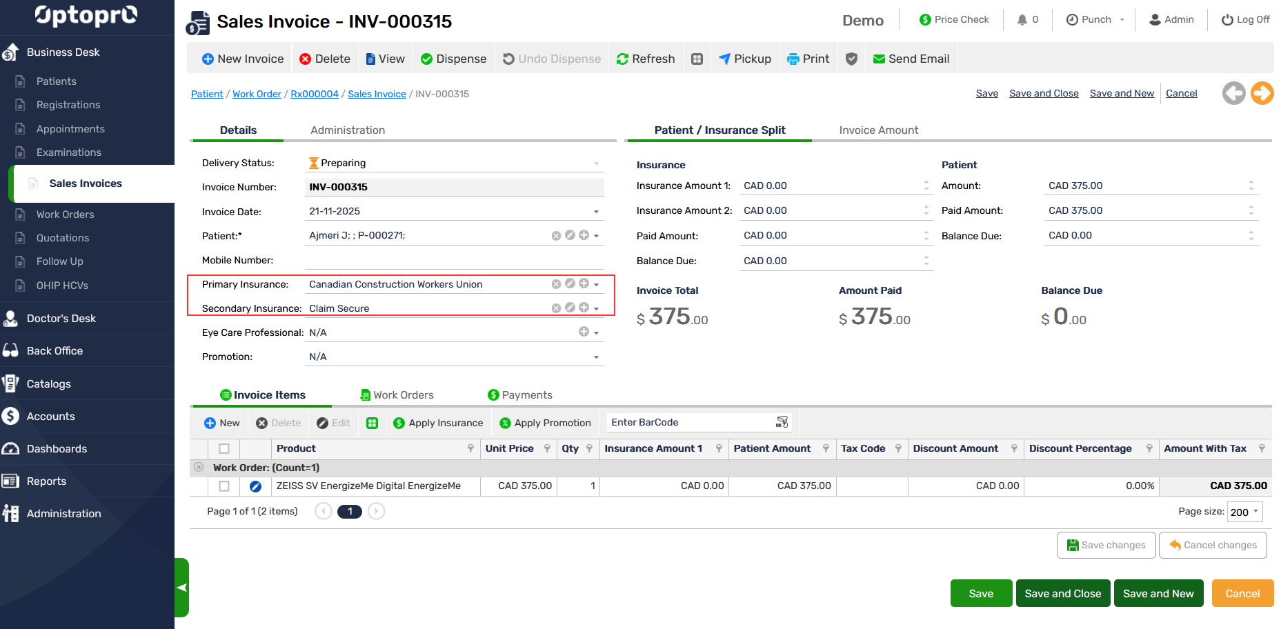 Optical purchases often involve both patient and insurance contributions. Optopro enables: