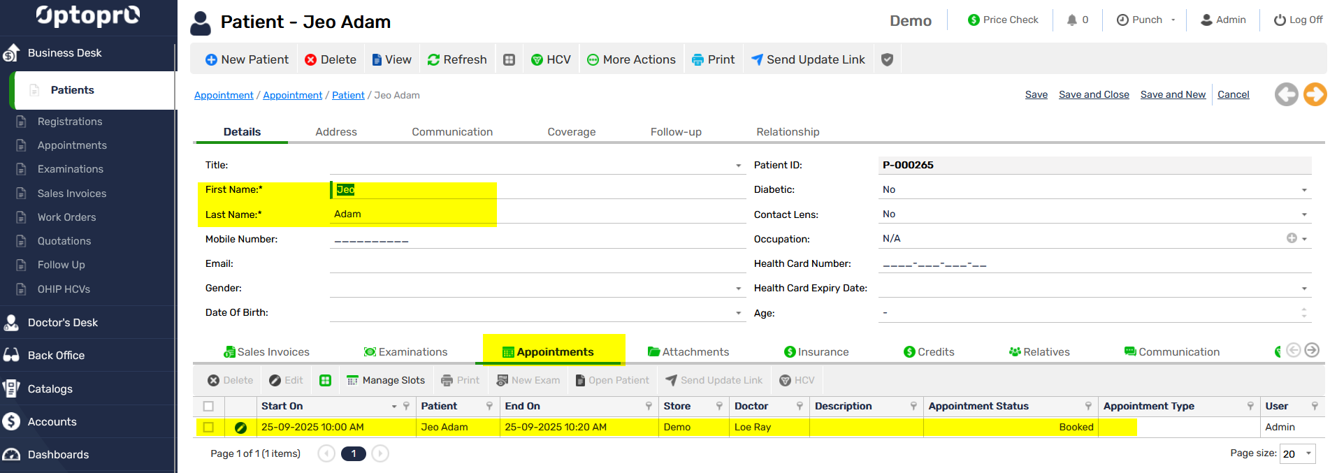 Once the appointment is booked, you can view it under the “Appointments” tab in patient’s profile as shown below