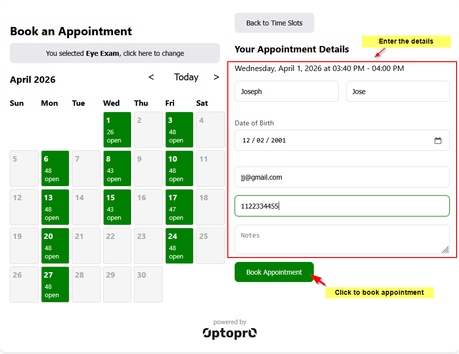 With this feature, patients can view real-time availability and select appointment slots that suit their schedule, enhancing both convenience and overall experience. Upon booking, appointments are instantly captured within the Optopro system, and the store is promptly notified—eliminating the need for manual entry or follow-ups.