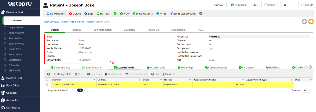 The appointment booked online by patient is now available in the respective patient profile.