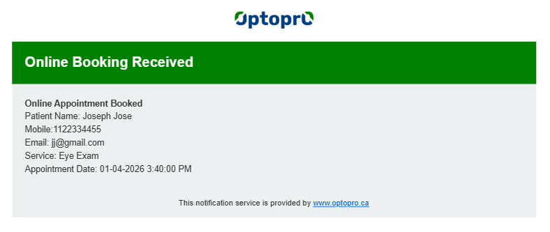 Once patient books the appointment from your website, the store will receive an instant notification about the booking. This appointment is instantly synchronized in Optopro, reducing the risk of double bookings or missed entries.