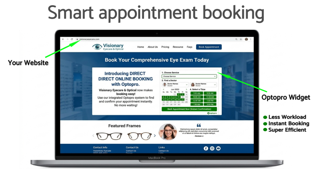 This feature is available upon request. Optopro provides a customizable widget that can be easily integrated into your existing website, enabling a smooth and professional booking experience for your patients.