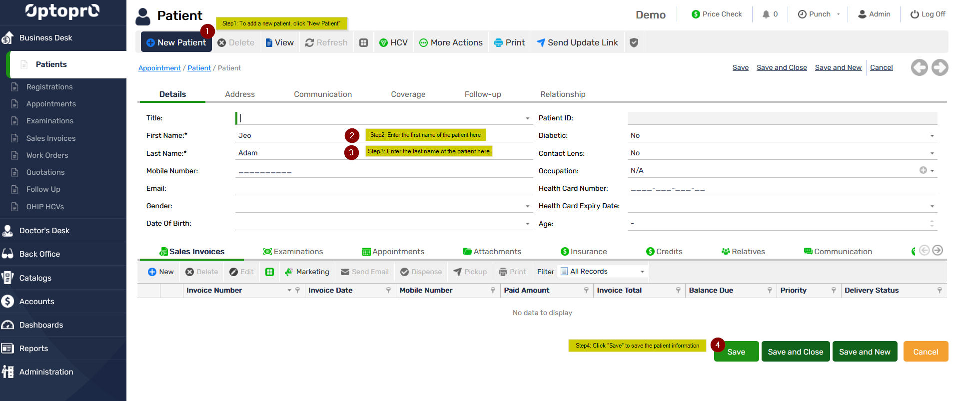 Patient Registration is the first step in creating a complete and compliant patient profile in Optopro. The module ensures that all necessary demographic, insurance, and contact details are accurately collected before the examination or any service delivery.