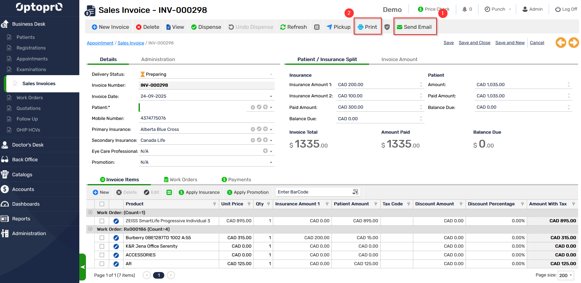 Email & Print Options: Generate professional PDF invoices and send them directly to the patient via email. Print-ready formats are available for in-store use.