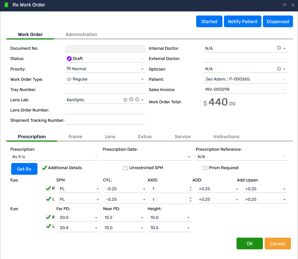 Create the work-order from the sales invoice or patient profile. Enter all relevant product details, prescription values, and instructions.